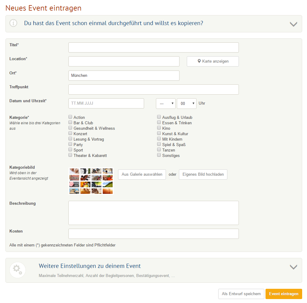 Das ist besonders praktisch, wenn ihr schnell noch etwas nachschauen müsst oder gerade eine Idee für ein Event habt, das ihr schnell aufschreiben möchtet, aber zu dem die Details noch fehlen. Und wie funktioniert das? Einfach wie gewohnt ein Event erstellen, die vorhandenen Daten eingeben und am Ende auf „Als Entwurf speichern“ klicken. Dann könnt ihr in aller Ruhe die noch fehlenden Infos sammeln und später eintragen.