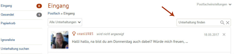In der Postfachübersicht gab es bisher bereits eine Suchfunktion; diese haben wir noch weiter optimiert. Einfach auf „Unterhaltung durchsuchen“ klicken und anschließend nach Benutzernamen des Chatpartners, Betreff einer Gruppennachricht, Name einer Gruppe oder Titel eines Events suchen und mit Hilfe der zusätzlichen Filter nach ungelesenen, unbeantworteten und vom Empfänger ungelesenen Nachrichten filtern.